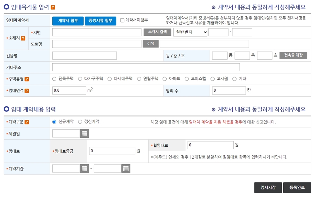신청인의 정보를 넣었으면 이제 임대차 계약서를 보면서 '임대목적물 입력'과 임대 계약내용을 입력합니다.