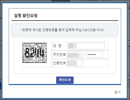 주민등록번호 옆의 '실명확인'을 클릭하면 확인요청 창이 뜹니다. 왼편에 보이는 인증번호를 그대로 넣으시면 되고요.