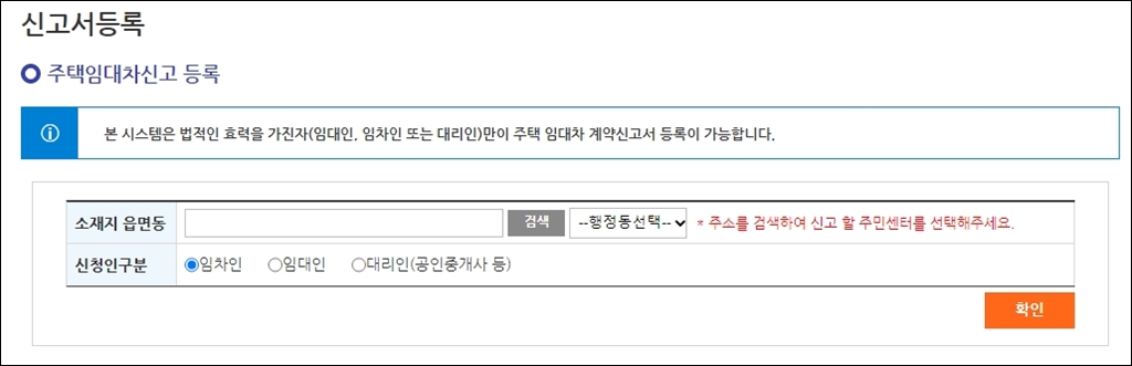 소재지 주소를 검색하고 지금 신청하는 분이 임차인인지 임대인인지 선택합니다.