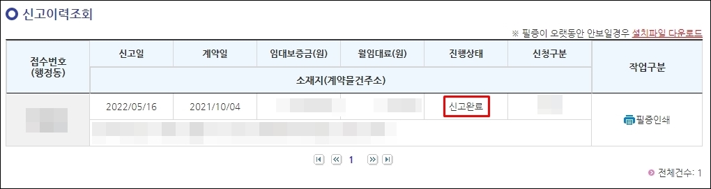 그리고 다음날 정도에 카톡으로 신고가 완료되었다는 문자가 오고 사이트에 다시 들어와 신고이력조회에 들어가 보면 이렇게 '신고 완료'로 변경이 되어 있습니다.